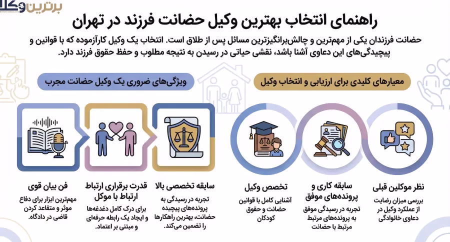 حضور یک وکیل با تجربه، تضمین مسیر قانونی امن است. وکلای حضانت فرزند با دانش و تخصص پرونده ها را به نتیجه مطلوب می رسانند. برای اطلاعات و مشاوره، لیست ۱۰ وکیل حضانت فرزند در تهران در دسترس است.